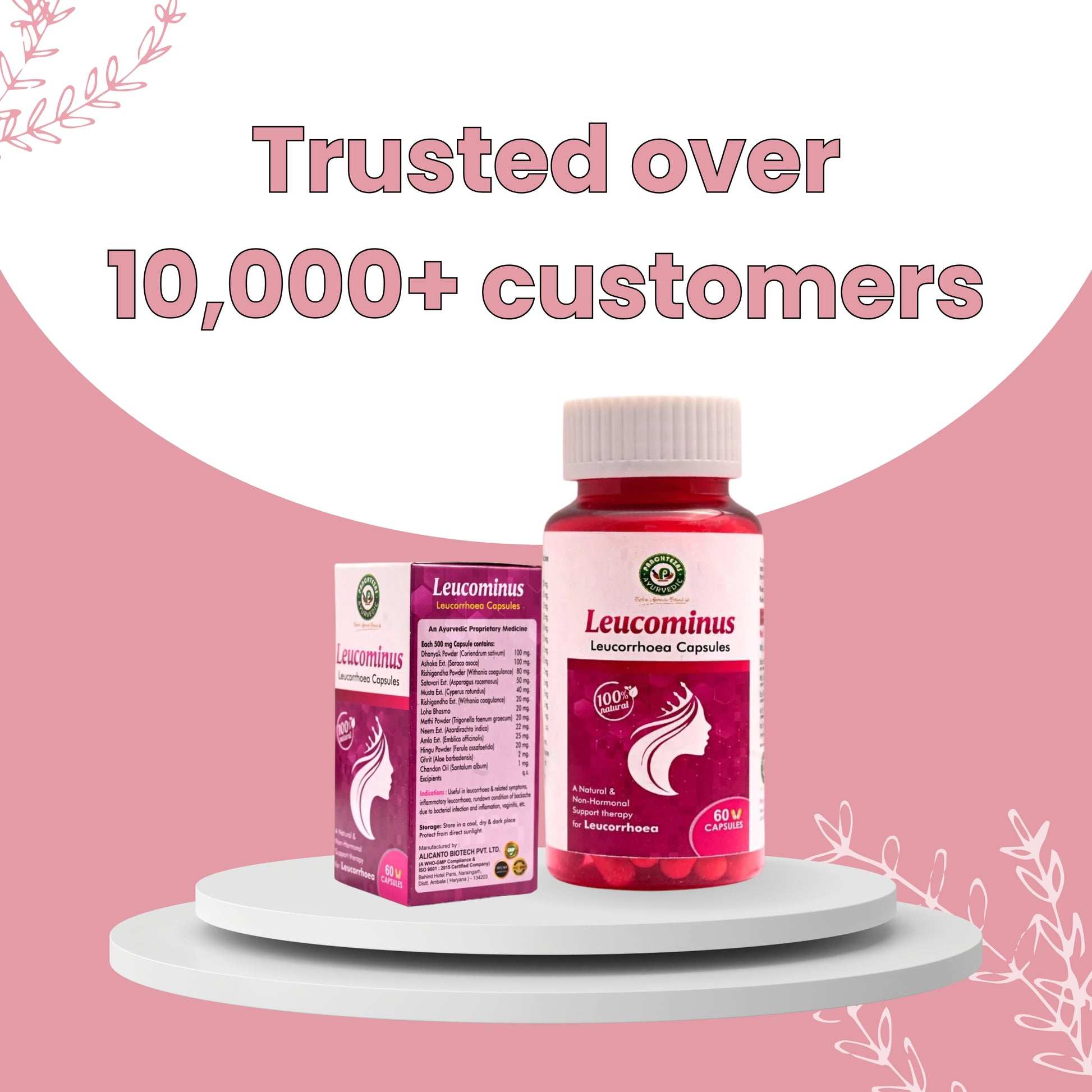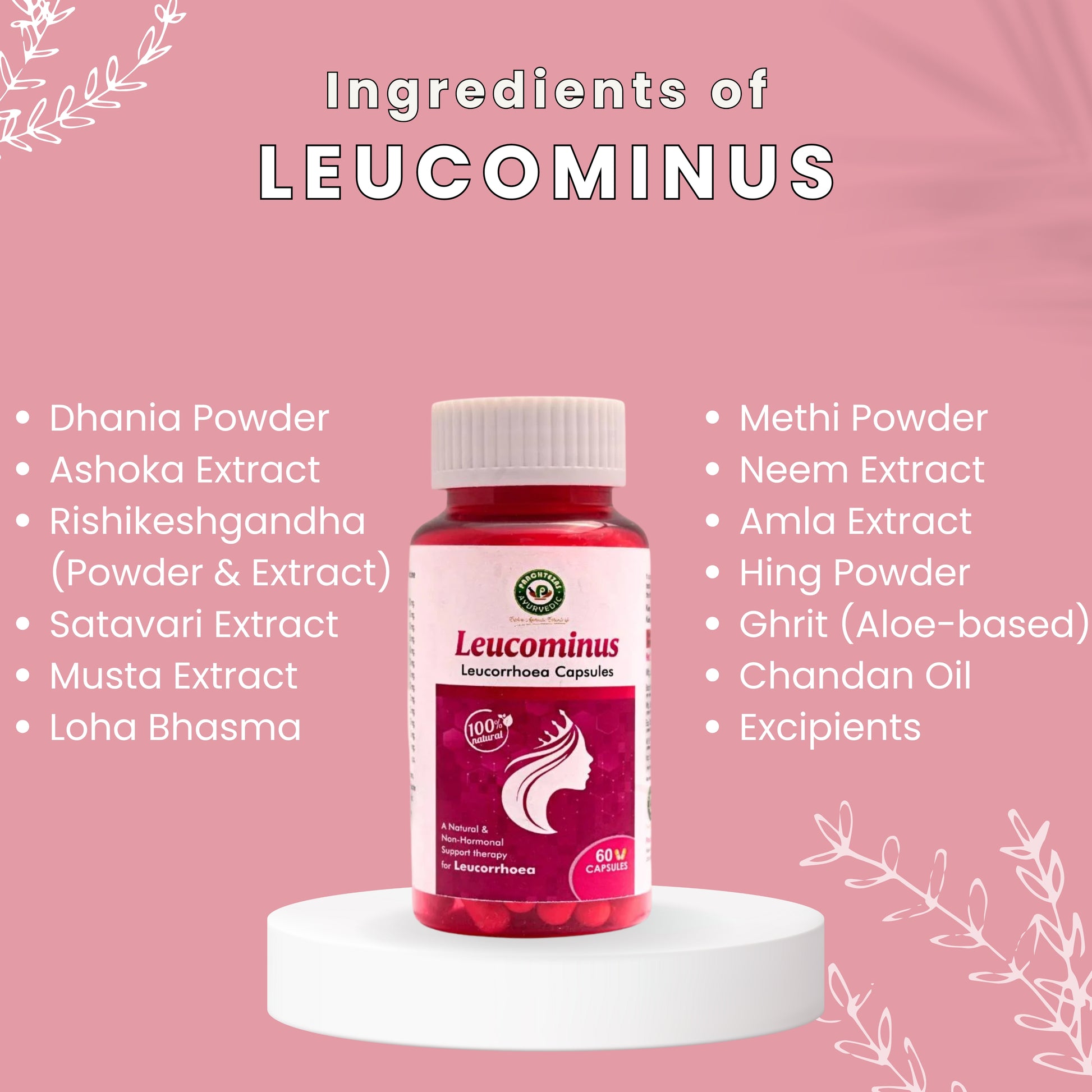 Leucominus is an Ayurvedic supplement designed to help manage leucorrhoea (white discharge) and support women’s reproductive health naturally.